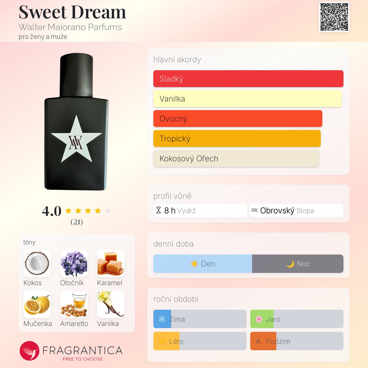 Sweet Dream podle Walter Maiorano Parfums je Orientální Vanilla vůně pro ženy a muže. Sweet Dream byl/a uveden/a v roce 2023. Sweet Dream byl/a vytvořen/a Walter Maiorano a Andrea Marcoccia. Vrchní tóny jsou Kokosový nektar, Karamel, Mučenka, Amaretto, Mango a Růžový pepř; střední tóny jsouKokosové mléko, Otočník, Vanilka, Bulharská růže, Jasmín Sambac a Fazole tonka ; základní tóny jsou Bourbonská vanilka, Ambrettolide, Ambra, Rum, Santalové dřevo, Vzácné dřevo a Cedr.