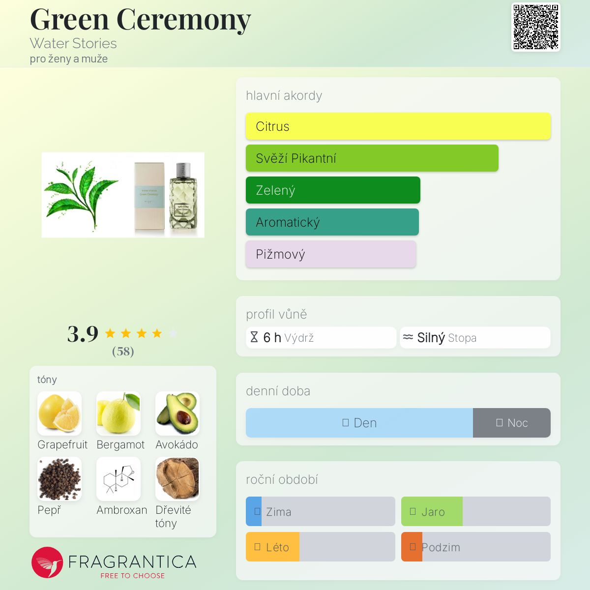 Green Ceremony podle Water Stories je Woody Aromatic vůně pro ženy a muže. Green Ceremony byl/a uveden/a v roce 2019. Vrchní tóny jsou Grapefruit a Bergamot; střední tóny jsouAvokádo a Pepř ; základní tóny jsou Ambroxan, Bílé dřevo a Pižmo.