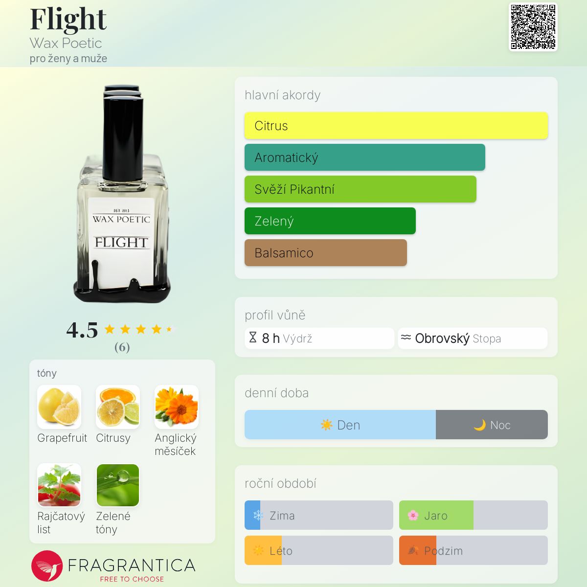 Flight podle Wax Poetic je Aromatic Fougere vůně pro ženy a muže. Flight byl/a uveden/a v roce 2015. "Nosem" za touto vůní je Jeanette Price.