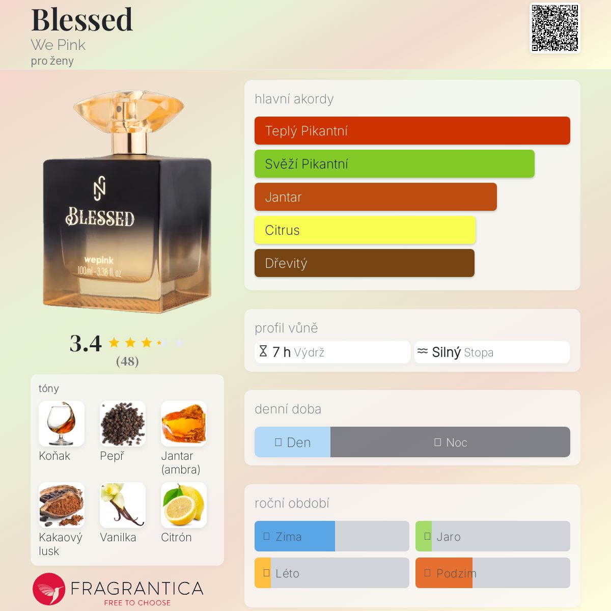 Blessed podle We Pink je Orientální vůně pro ženy. Blessed byl/a uveden/a v roce 2023. Vrchní tóny jsou Citrón, Kardamom, Zázvor a Grapefruit; střední tóny jsouKoňak, Černý pepř, Levandule a Damašská růže ; základní tóny jsou Jantar (ambra), Kakao a Vanilka.