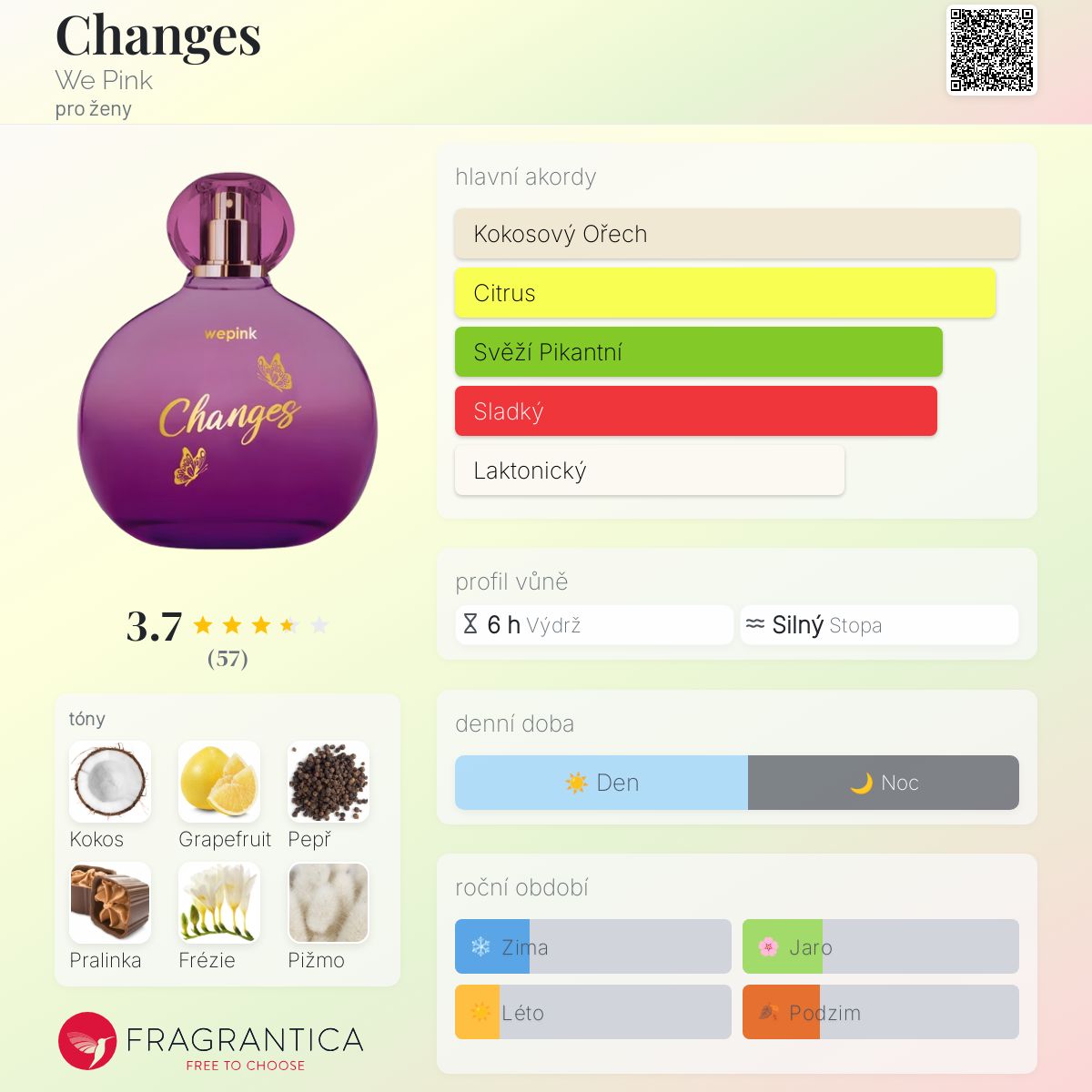Changes podle We Pink je Floral Fruity vůně pro ženy. Changes byl/a uveden/a v roce 2023. Vrchní tóny jsou Kokos, Grapefruit, Černý pepř a Frézie; střední tóny jsouRůže, Konvalinka, Jasmín a Cedr ; základní tóny jsou Pralinka, Pižmo a Jantar (ambra).