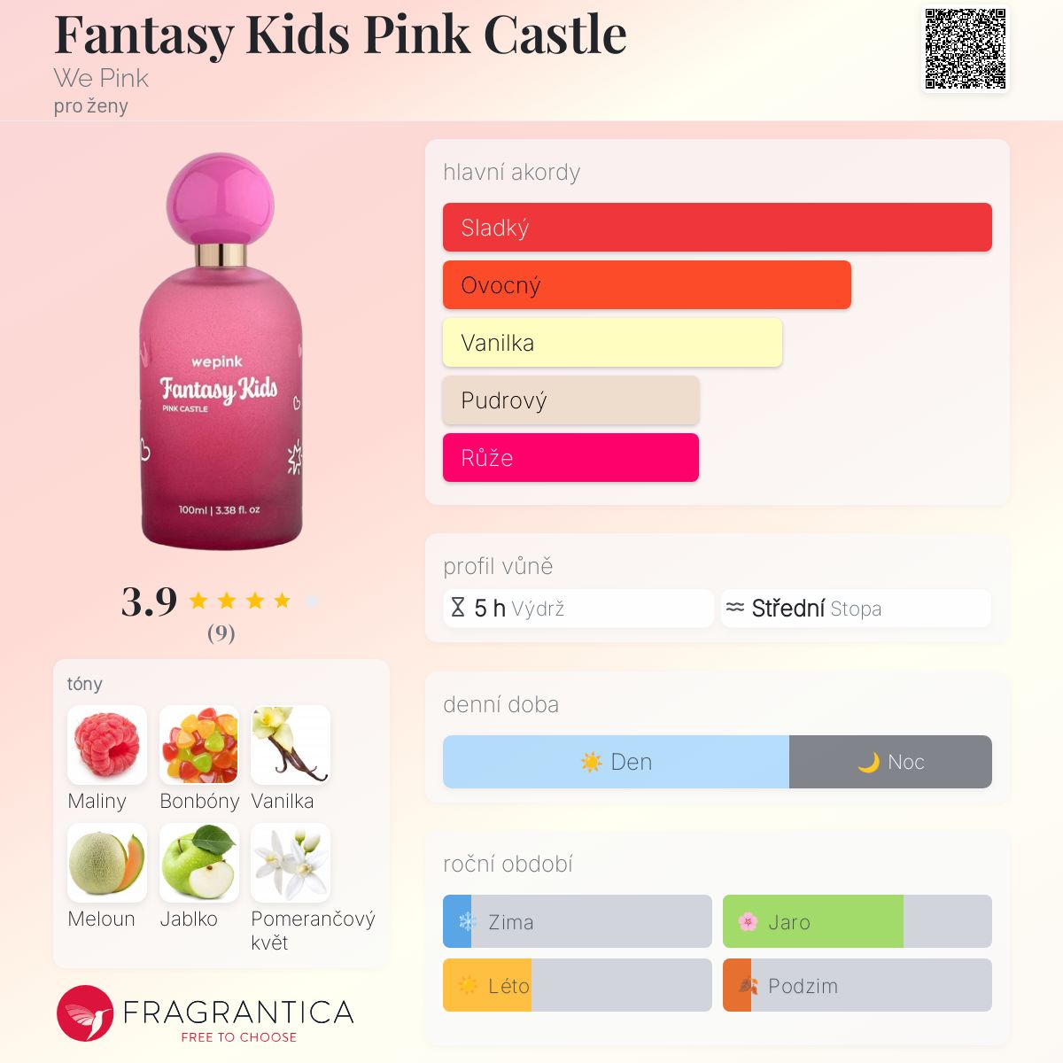 Fantasy Kids Pink Castle podle We Pink je Floral Fruity Gourmand vůně pro ženy. Toto je nová vůně. Fantasy Kids Pink Castle byl/a uveden/a v roce 2025. Vrchní tóny jsou Meloun a Jablko; střední tóny jsouMaliny, Karamel, Pomerančový květ, Jantar (ambra) a Jahoda ; základní tóny jsou Sladké tóny, Vanilka a Santalové dřevo.