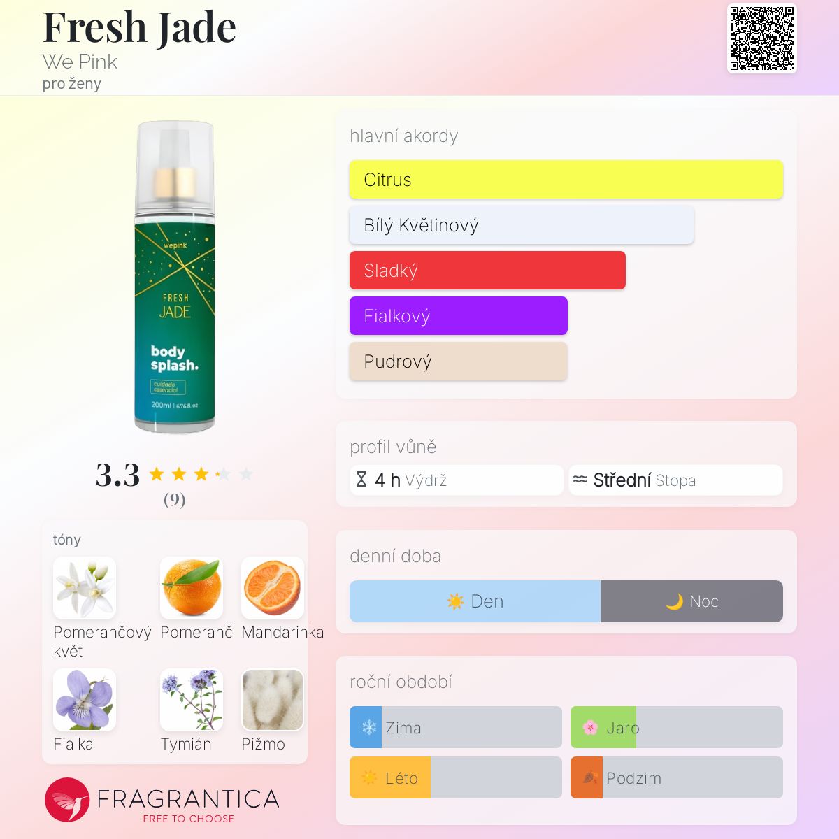 Fresh Jade podle We Pink je Orientální Vanilla vůně pro ženy. Toto je nová vůně. Fresh Jade byl/a uveden/a v roce 2024. Vrchní tóny jsou Pomeranč, Mandarinka a Červený tymián; střední tóny jsouPomerančový květ, Fialka a Jasmín ; základní tóny jsou Pižmo, Jantar (ambra) a Vanilka.