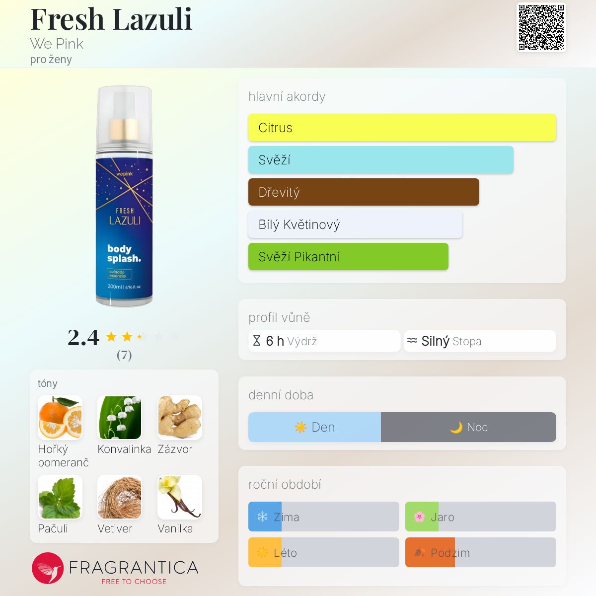 Fresh Lazuli podle We Pink je Floral vůně pro ženy. Toto je nová vůně. Fresh Lazuli byl/a uveden/a v roce 2024. Vrchní tóny jsou Hořký pomeranč, Zázvor a Frézie; střední tóny jsouKonvalinka, Vetiver, Ylang-Ylang a Damašská růže ; základní tóny jsou Pačuli, Vanilka, Jantar (ambra) a Pižmo.