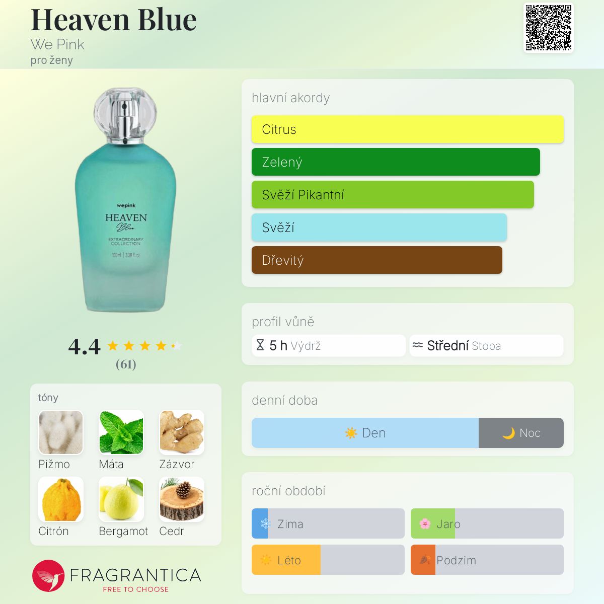 Heaven Blue podle We Pink je Citrus Aromatic vůně pro ženy. Toto je nová vůně. Heaven Blue byl/a uveden/a v roce 2025. Vrchní tóny jsou Zázvor, Máta, Zedrát, Růžový pepř a Bergamot; střední tóny jsouCedr, Konvalinka, Kadidlo, Skořice a Neroli ; základní tóny jsou Pižmo, Černý čaj, Santalové dřevo a Jantar (ambra).