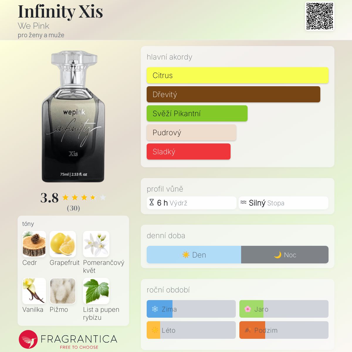 Infinity Xis podle We Pink je Floral Fruity vůně pro ženy a muže. Toto je nová vůně. Infinity Xis byl/a uveden/a v roce 2025. Vrchní tóny jsou Grapefruit a Černý rybíz; střední tóny jsouPomerančový květ, Konvalinka, Jasmín a Růže ; základní tóny jsou Cedr, Vanilka, Pižmo, Pryskyřičné tóny a Jantar (ambra).