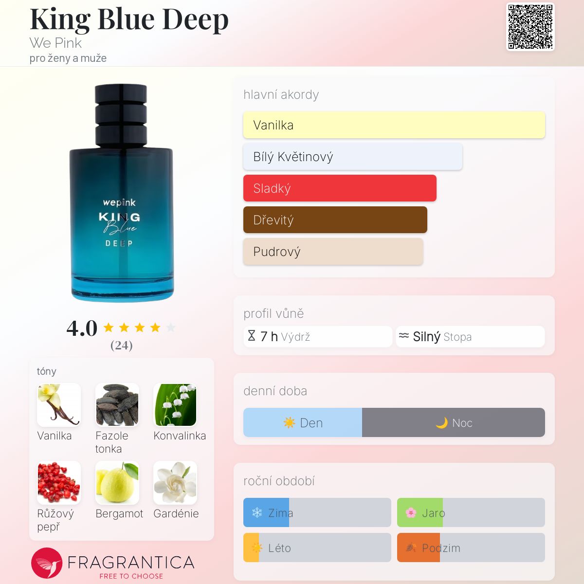 King Blue Deep podle We Pink je Woody vůně pro ženy a muže. Toto je nová vůně. King Blue Deep byl/a uveden/a v roce 2025. Vrchní tóny jsou Růžový pepř a Bergamot; střední tóny jsouKonvalinka a Gardénie ; základní tóny jsou Vanilka, Fazole tonka, Santalové dřevo a Pačuli.