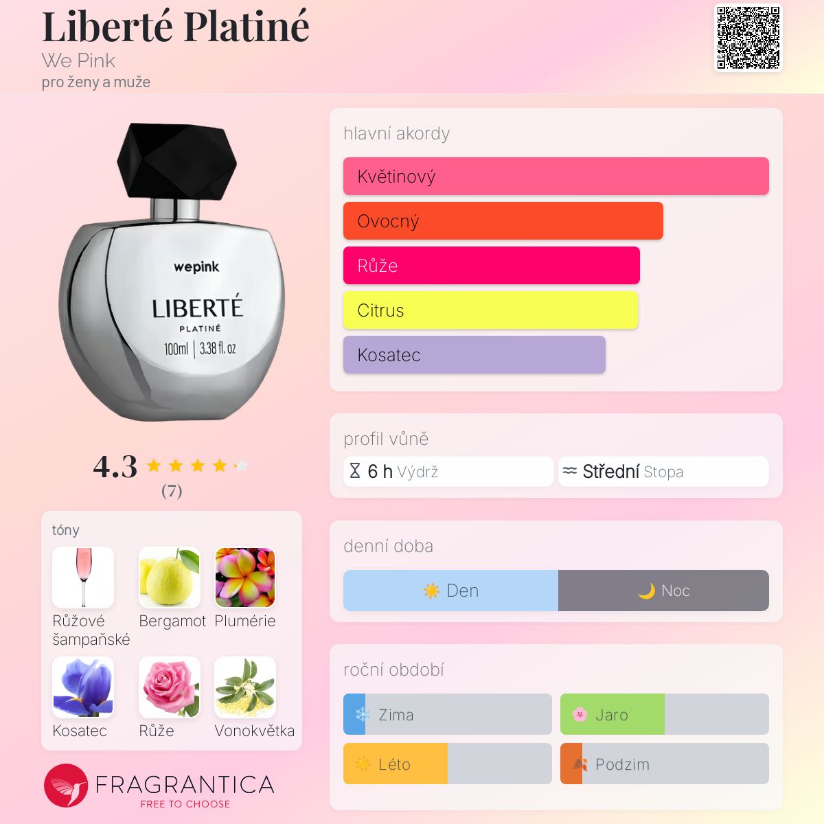 Liberté Platiné podle We Pink je Orientální Floral vůně pro ženy a muže. Toto je nová vůně. Liberté Platiné byl/a uveden/a v roce 2025. Vrchní tóny jsou Růžové šampaňské, Bergamot, Plumérie, Broskev a Hruška; střední tóny jsouKosatec, Růže de Mai, Vonokvětka a Pivoňka ; základní tóny jsou Pižmo, Santalové dřevo, Jantar (ambra) a Vanilka.