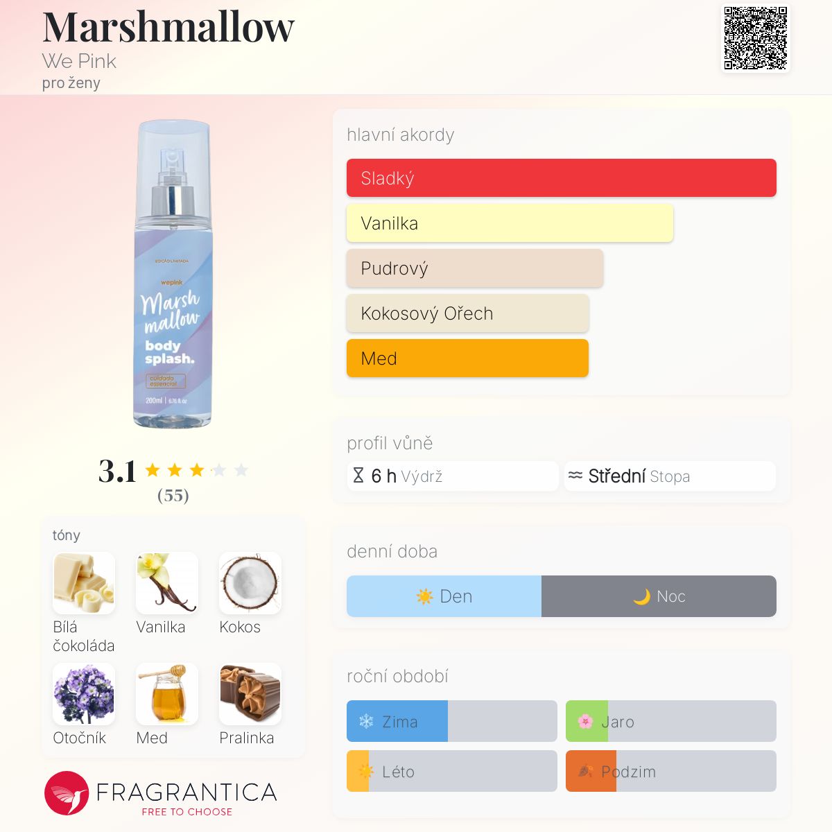 Marshmallow podle We Pink je Aromatic vůně pro ženy. Marshmallow byl/a uveden/a v roce 2023. Vrchní tóny jsou Bílá čokoláda, Kokos a Magnólie; střední tóny jsouOtočník a Kakao ; základní tóny jsou Vanilka, Med a Pralinka.