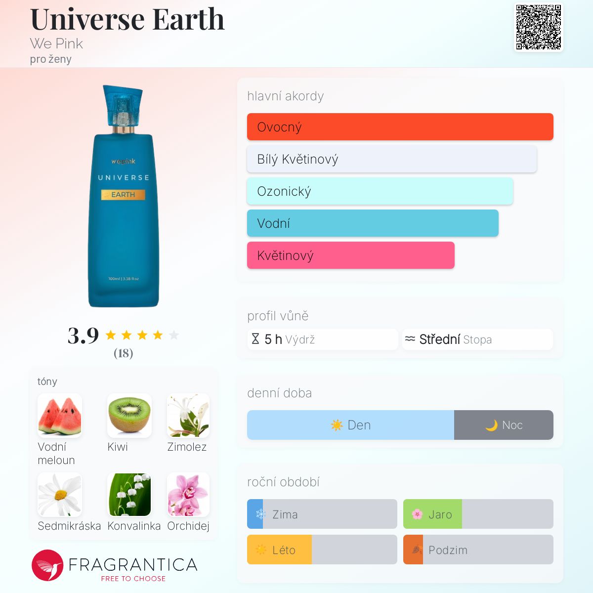 Universe Earth podle We Pink je Floral Fruity vůně pro ženy. Toto je nová vůně. Universe Earth byl/a uveden/a v roce 2024. Vrchní tóny jsou Vodní meloun a Kiwi; střední tóny jsouZimolez, Sedmikráska a Konvalinka ; základní tóny jsou Orchidej a Jantar (ambra).