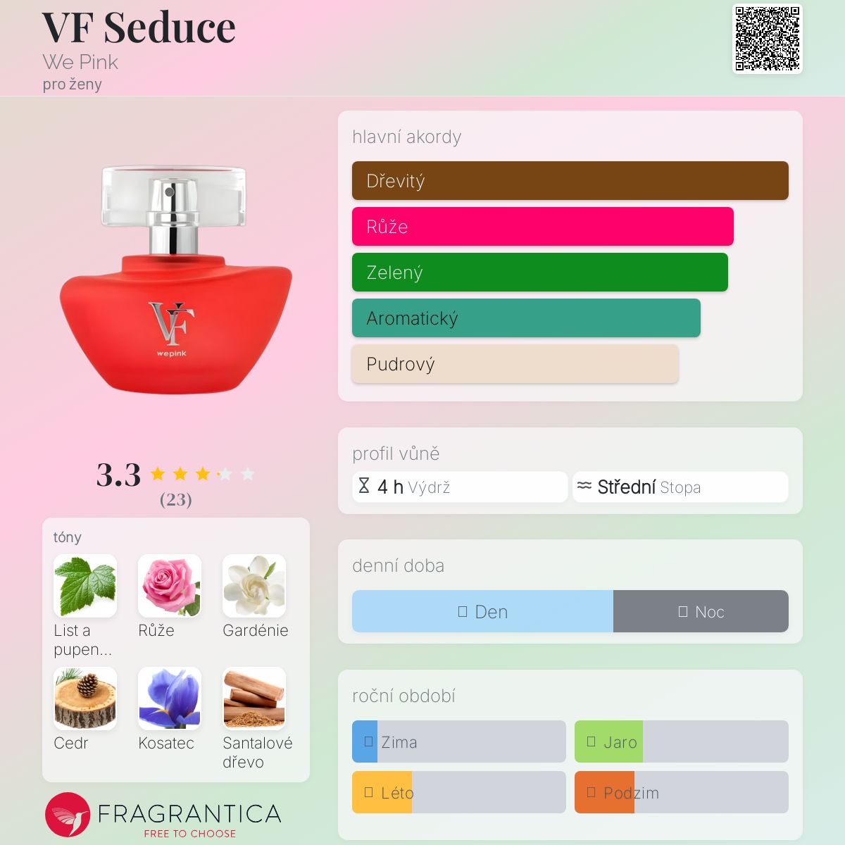 VF Seduce podle We Pink je Floral Fruity vůně pro ženy. Toto je nová vůně. VF Seduce byl/a uveden/a v roce 2025. Vrchní tóny jsou Černý rybíz a Zelené listí; střední tóny jsouRůže, Gardénie a Kosatec ; základní tóny jsou Cedr, Santalové dřevo, Jantar (ambra) a Pižmo.