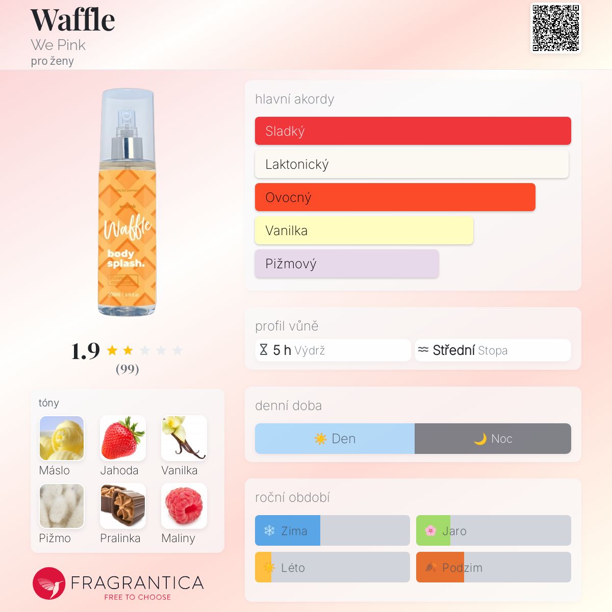 Waffle podle We Pink je Aromatic Fruity vůně pro ženy. Waffle byl/a uveden/a v roce 2023. Vrchní tóny jsou Jahoda, Maliny a Mandle; střední tóny jsouMáslo, Broskvový květ a Fialka ; základní tóny jsou Vanilka, Pižmo a Pralinka.