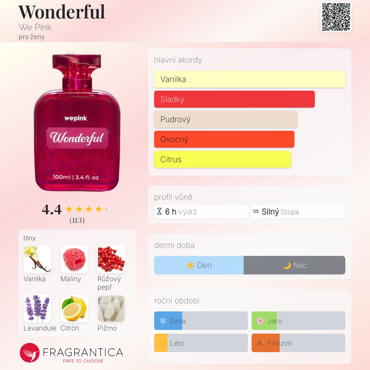 Wonderful podle We Pink je Orientální Floral vůně pro ženy. Toto je nová vůně. Wonderful byl/a uveden/a v roce 2024. Vrchní tóny jsou Maliny, Růžový pepř, Citrón a Bergamot; střední tóny jsouLevandule, Jasmín a Růže ; základní tóny jsou Vanilka, Pižmo a Santalové dřevo.