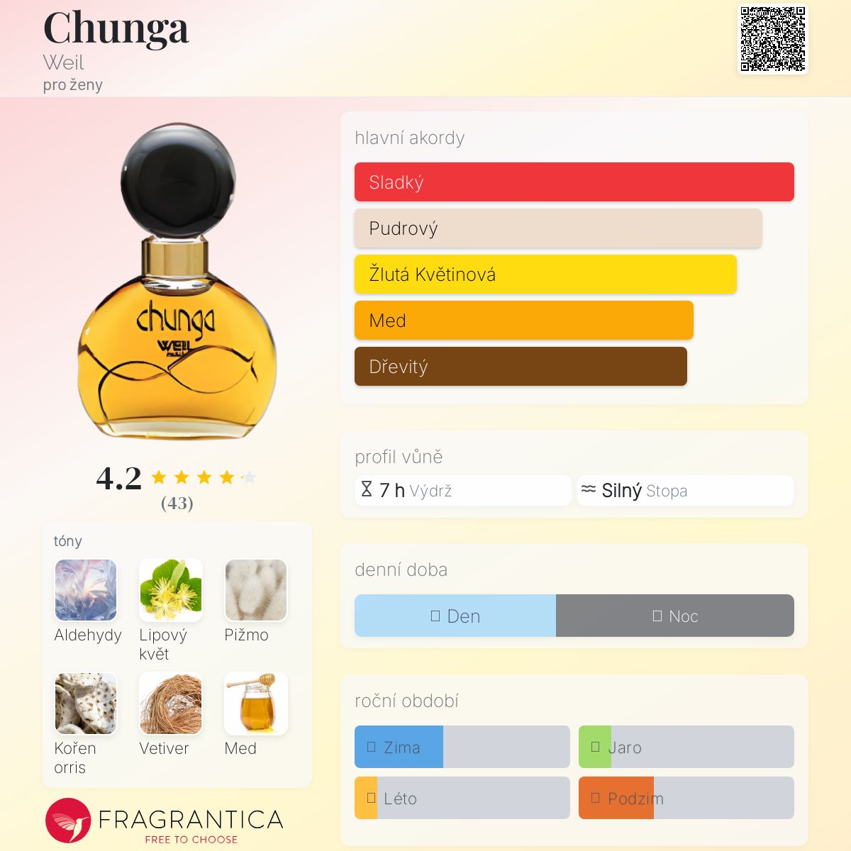 Chunga podle Weil je Floral Aldehyde vůně pro ženy. Chunga byl/a uveden/a v roce 1977. "Nosem" za touto vůní je Jean-Pierre Weil.
