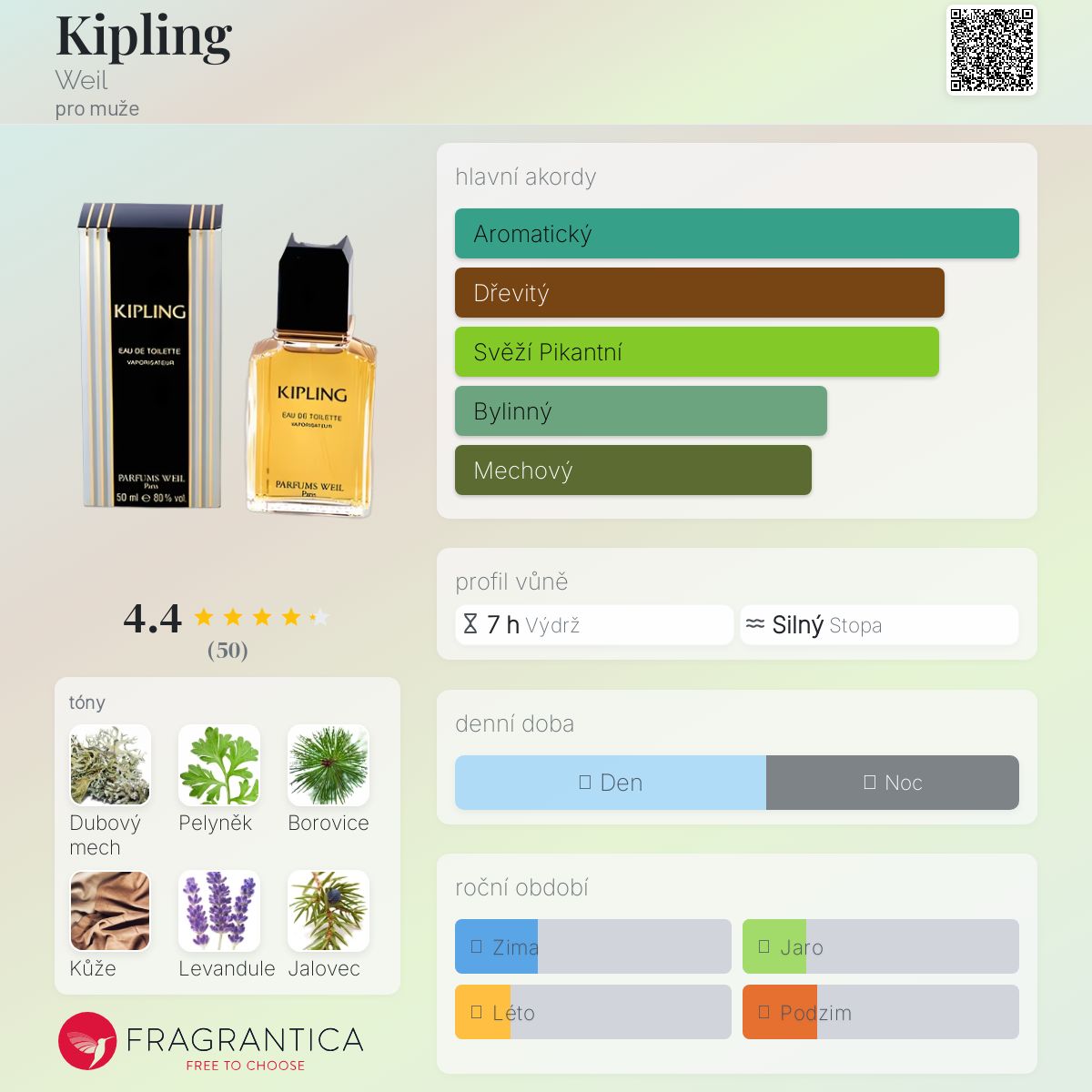 Kipling podle Weil je Aromatic vůně pro muže. Kipling byl/a uveden/a v roce 1986. "Nosem" za touto vůní je Jean-Pierre Mary. Vrchní tóny jsou Pelyněk, Levandule, Jalovec, Bergamot a Citrón; střední tóny jsouBorovice, Bazalka, Pelargónie, Karafiát a Jasmín ; základní tóny jsou Dubový mech, Kůže, Pižmo, Pačuli a Cedr.