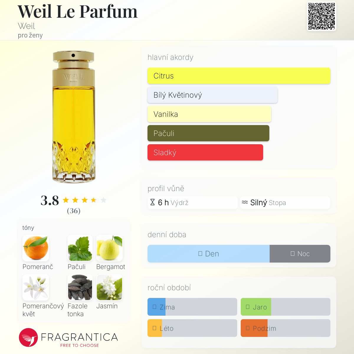 Weil Le Parfum podle Weil je Orientální Floral vůně pro ženy. Weil Le Parfum byl/a uveden/a v roce 2019. Vrchní tóny jsou Pomeranč, Bergamot a Pomerančový květ; střední tóny jsouJasmín a Růže ; základní tóny jsou Pačuli, Fazole tonka a Vanilka.