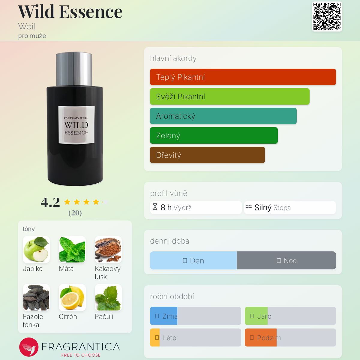 Wild Essence podle Weil je Orientální Woody vůně pro muže. Wild Essence byl/a uveden/a v roce 2012. Vrchní tóny jsou Zelené jablko, Máta, Citrón a Kardamom; střední tóny jsouSkořice, Černý pepř, Muškátový oříšek, Levandule a Santalové dřevo ; základní tóny jsou Kakao, Fazole tonka, Pačuli, Ambra a Tabák.