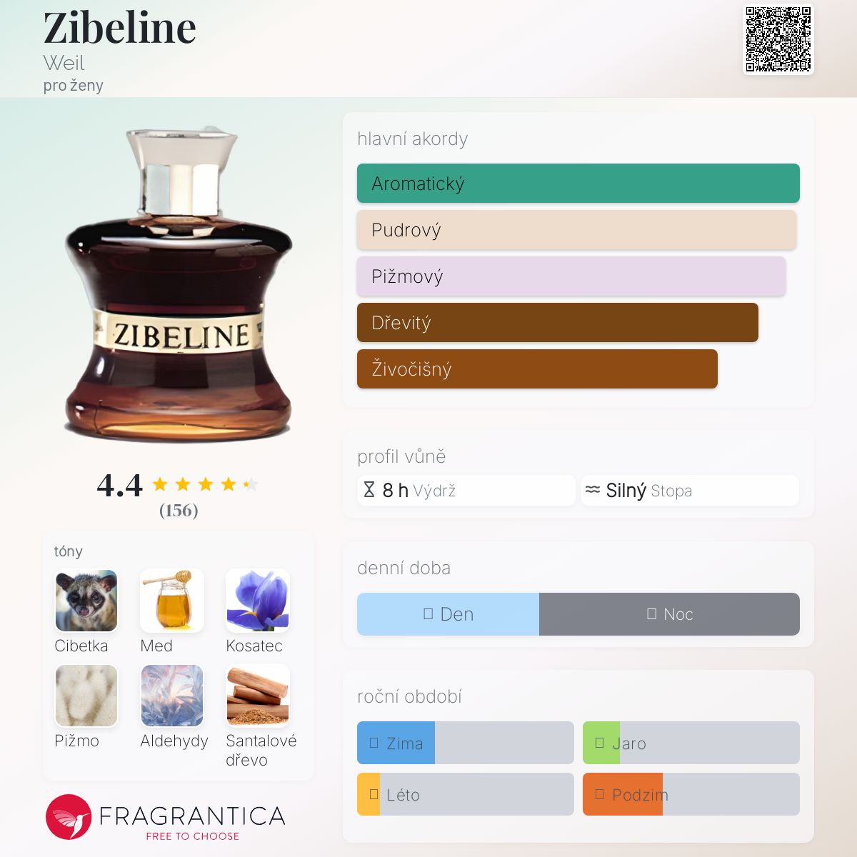 Zibeline podle Weil je Floral Aldehyde vůně pro ženy. Zibeline byl/a uveden/a v roce 1928. "Nosem" za touto vůní je Claude Fraysse. Vrchní tóny jsou Aldehydy, Estragon, Koriandr, Bergamot a Citrón; střední tóny jsouKosatec, Jasmín, Ylang-Ylang, Růže, Gardénie a Konvalinka ; základní tóny jsou Cibetka, Med, Pižmo, Santalové dřevo, Fazole tonka, Vetiver a Jantar (ambra).