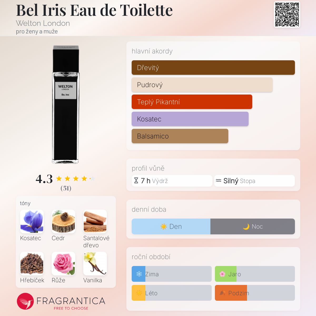 Bel Iris Eau de Toilette podle Welton London je Woody Spicy vůně pro ženy a muže. Bel Iris Eau de Toilette byl/a uveden/a v roce 2013. "Nosem" za touto vůní je John-Paul Welton. Vrchní tóny jsou Měsíček a Broskev; střední tóny jsouKosatec, Cedr, Hřebíček, Růže a Jasmín ; základní tóny jsou Santalové dřevo, Vanilka, Pačuli a Pižmo.