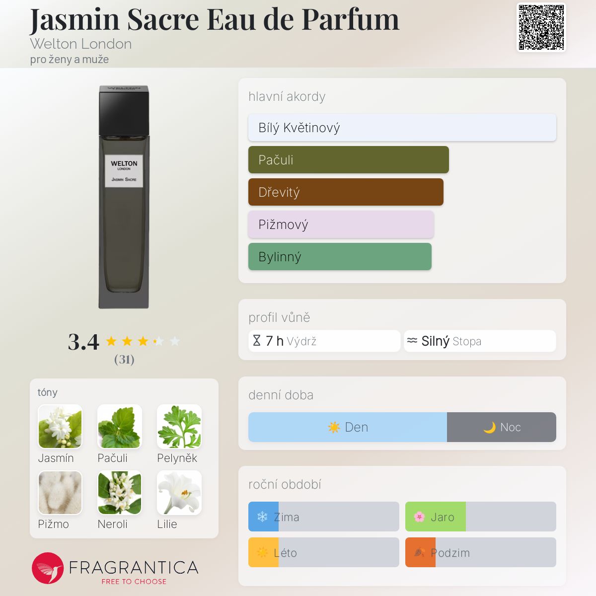 Jasmin Sacre Eau de Parfum podle Welton London je Orientální Floral vůně pro ženy a muže. Jasmin Sacre Eau de Parfum byl/a uveden/a v roce 2017. "Nosem" za touto vůní je John-Paul Welton. Vrchní tóny jsou Jasmín, Neroli a Labdanum; střední tóny jsouPelyněk, Bílá lilie a Marocká růže ; základní tóny jsou Pačuli, Pižmo a Santalové dřevo.