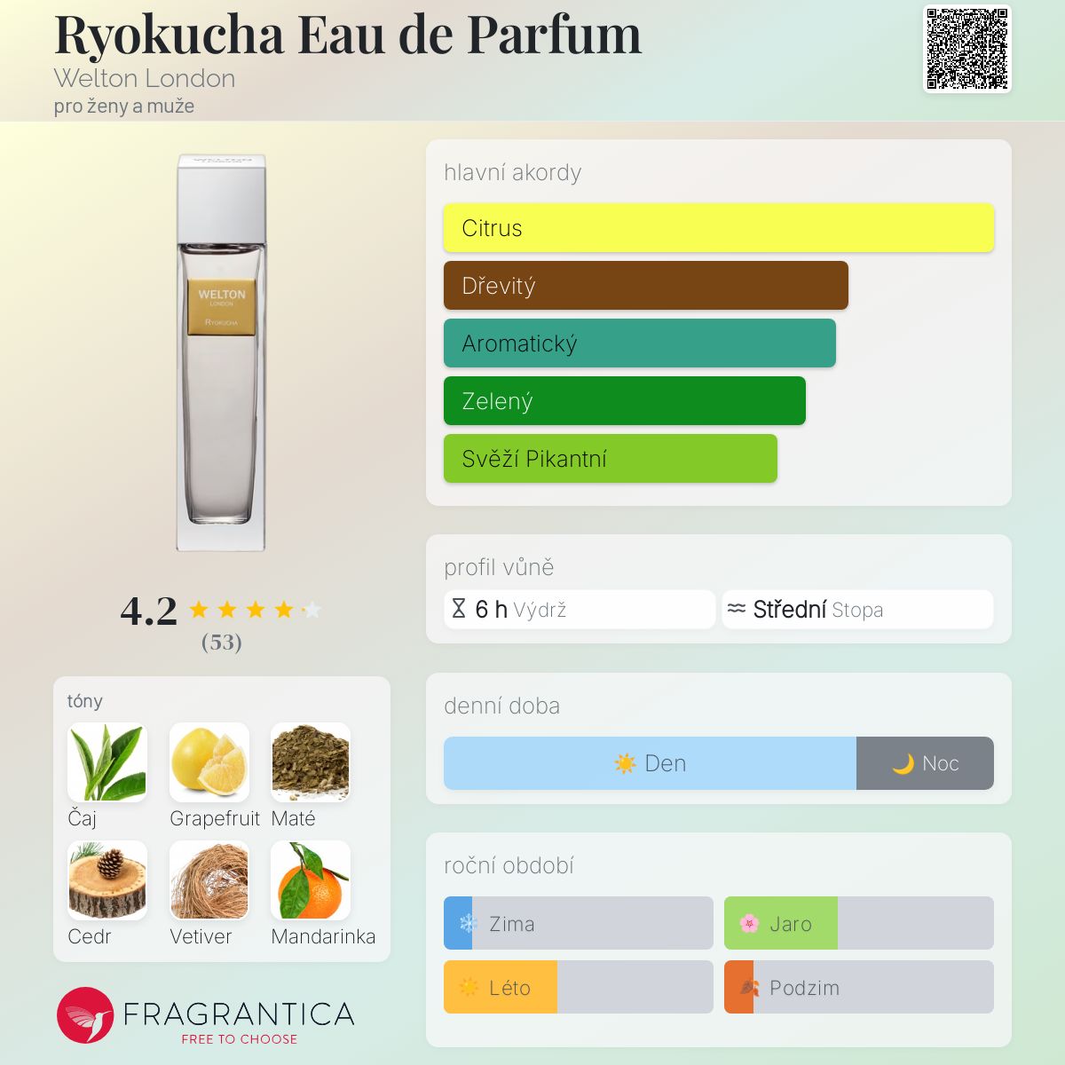 Ryokucha Eau de Parfum podle Welton London je Citrus vůně pro ženy a muže. Ryokucha Eau de Parfum byl/a uveden/a v roce 2020. "Nosem" za touto vůní je John-Paul Welton. Vrchní tóny jsou Grapefruit, Mandarinka a Hořký pomeranč; střední tóny jsouZelený čaj a Maté ; základní tóny jsou Atlasový cedr, Vetiver a Ambra.