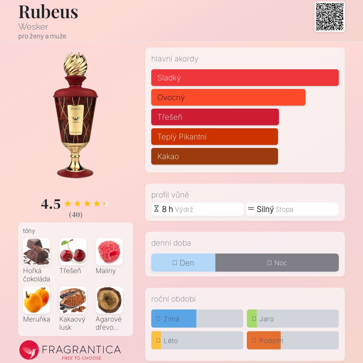 Rubeus podle Wesker je vůně pro ženy a muže. Rubeus byl/a uveden/a v roce 2025. Vrchní tóny jsou Třešeň, Maliny a Kakao; střední tóny jsouHořká čokoláda, Meruňka a Nugát ; základní tóny jsou Agarové dřevo (oud), Lískový oříšek, Vanilka a Karamel.