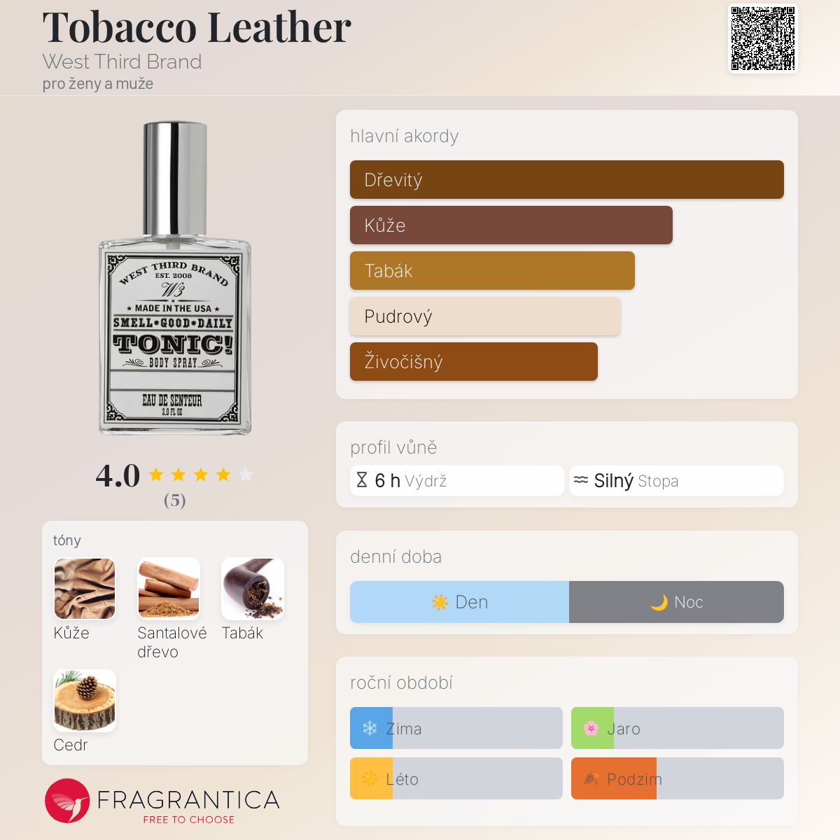 Tobacco Leather podle West Third Brand je Leather vůně pro ženy a muže. Tobacco Leather byl/a uveden/a v roce 2016. "Nosem" za touto vůní je Michael Loring Probst.