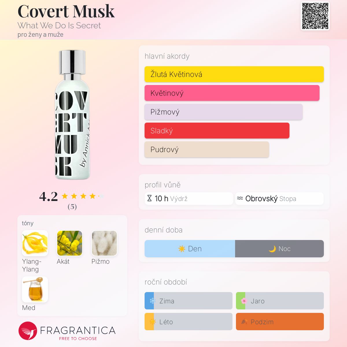 Covert Musk podle What We Do Is Secret je Floral Woody Musk vůně pro ženy a muže. Toto je nová vůně. Covert Musk byl/a uveden/a v roce 2025. "Nosem" za touto vůní je Annick Menardo. Vrchní tóny jsou Akát a Med; střední tón jeYlang-Ylang ; základní tón je Pižmo.