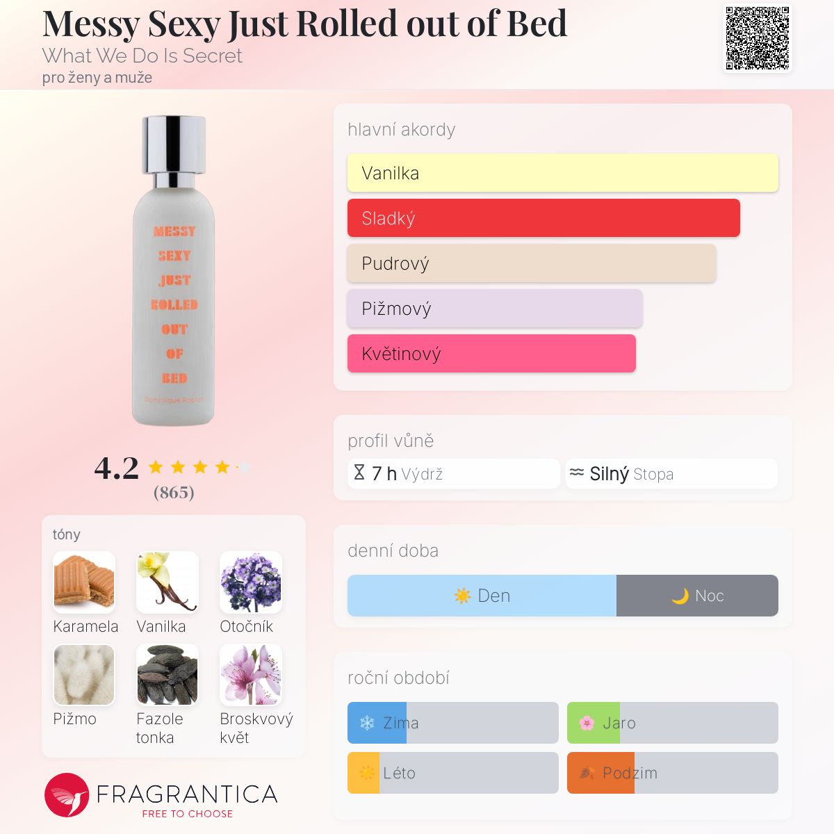 Messy Sexy Just Rolled out of Bed podle What We Do Is Secret je Orientální Floral vůně pro ženy a muže. Messy Sexy Just Rolled out of Bed byl/a uveden/a v roce 2016. "Nosem" za touto vůní je Dominique Ropion. Vrchní tóny jsou Broskvový květ a Bergamot; střední tóny jsouOtočník a Turecká růže ; základní tóny jsou Karamela, Vanilka, Pižmo, Fazole tonka, Kašmírové dřevo, Santalové dřevo a Jantar (ambra).