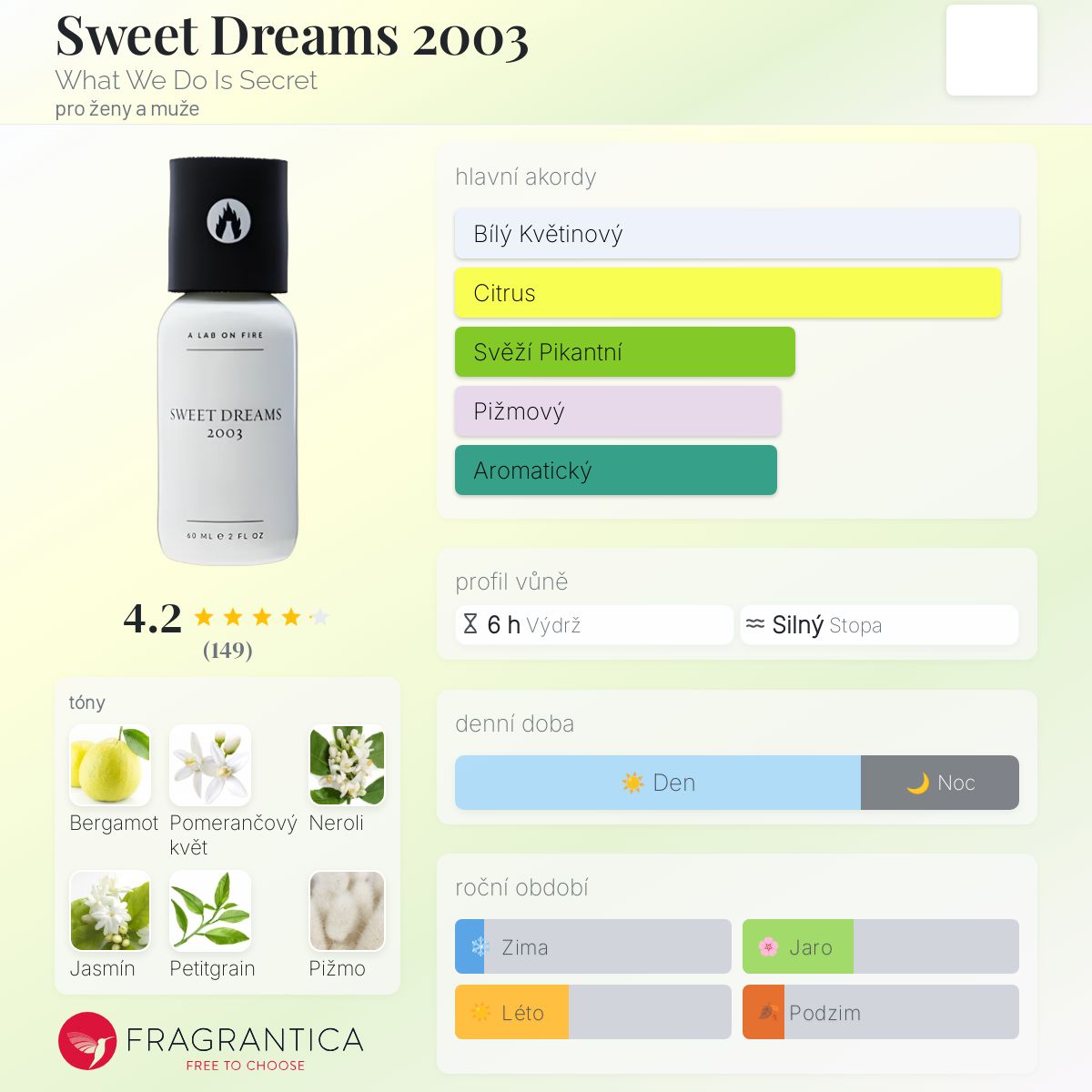 Sweet Dreams 2003 podle What We Do Is Secret je Orientální Floral vůně pro ženy a muže. Sweet Dreams 2003 byl/a uveden/a v roce 2012. "Nosem" za touto vůní je Thierry Wasser. Vrchní tóny jsou Bergamot, Neroli a Petitgrain; střední tóny jsouPomerančový květ a Jasmín ; základní tóny jsou Pižmo, Jantar (ambra) a Kastoreum.