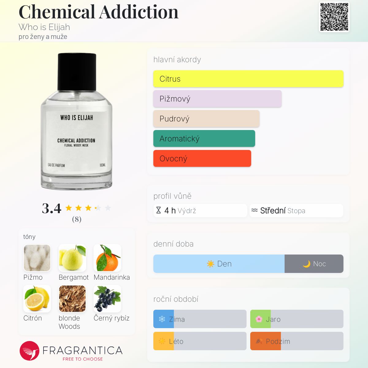 Chemical Addiction podle Who is Elijah je Floral Fruity vůně pro ženy a muže. Toto je nová vůně. Chemical Addiction byl/a uveden/a v roce 2025. Vrchní tóny jsou Bergamot, Mandarinka a Citrón; střední tón jeČerný rybíz ; základní tóny jsou Pižmo a Světlá dřeva.