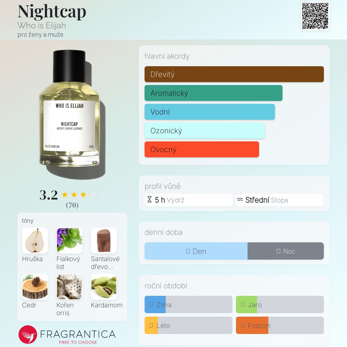 Nightcap podle Who is Elijah je Woody Aromatic vůně pro ženy a muže. Nightcap byl/a uveden/a v roce 2022. "Nosem" za touto vůní je Raquel Bouris. Vrchní tóny jsou Hruška, Fialkový list a Kardamom; střední tóny jsouKořen orris, Cypřiš a Amyris ; základní tóny jsou Santalové dřevo Mysore, Extrakt z bílého cedru a Madagaskarský vetiver.