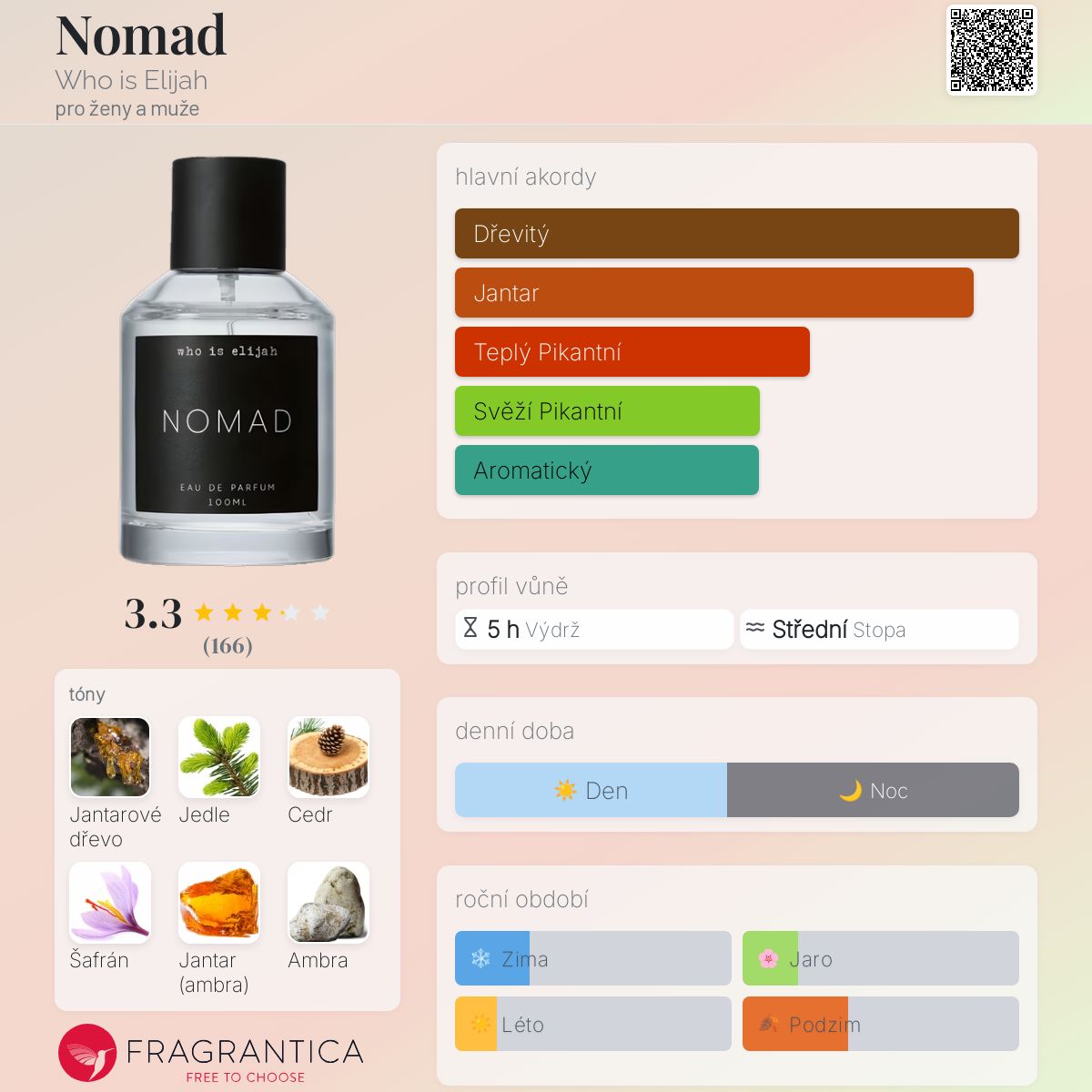 Nomad podle Who is Elijah je Floral Woody Musk vůně pro ženy a muže. Nomad byl/a uveden/a v roce 2021. "Nosem" za touto vůní je Raquel Bouris. Vrchní tóny jsou Šafrán, Egyptský jasmín a Mandle; střední tóny jsouJantarové dřevo, Ambra a Bulharská růže ; základní tóny jsou Jedlová pryskyřice, Cedr, Jemný jantar (ambra), Pižmo a Mech.