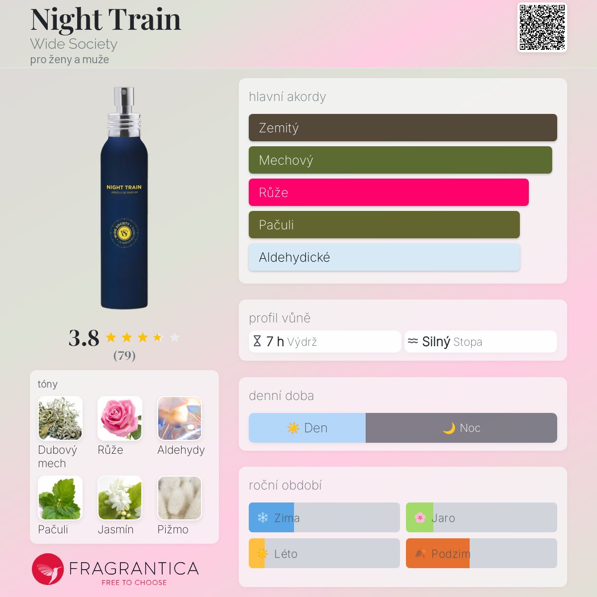 Night Train podle Wide Society je Chypre Floral vůně pro ženy a muže. Night Train byl/a uveden/a v roce 2018. "Nosem" za touto vůní je Alexandra Monet. Vrchní tóny jsou Aldehydy a Bergamot; střední tóny jsouRůže a Jasmín Sambac ; základní tóny jsou Dubový mech, Pačuli, Pižmo, Kůže a Vanilka.