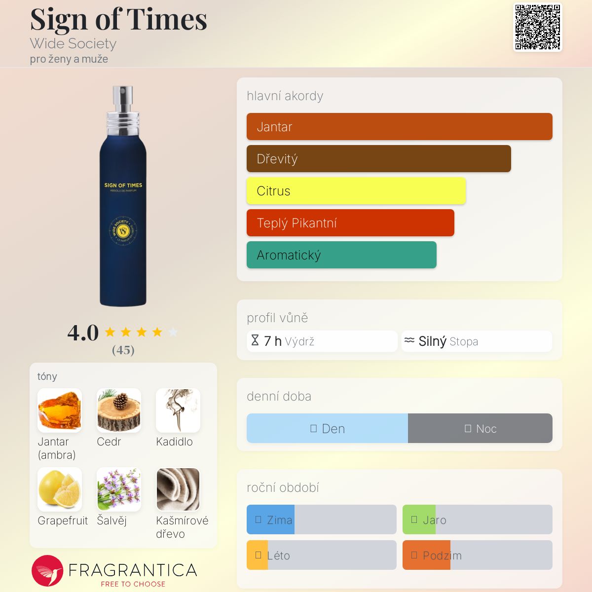 Sign of Times podle Wide Society je Woody Floral Musk vůně pro ženy a muže. Sign of Times byl/a uveden/a v roce 2018. "Nosem" za touto vůní je Emilie Coppermann. Vrchní tóny jsou Grapefruit a Pomeranč; střední tóny jsouŠalvěj, Růže, Skořice a Pomerančový květ ; základní tóny jsou Jantar (ambra), Cedr, Kadidlo, Kašmírové dřevo, Šafrán, Pižmo a Vanilka.