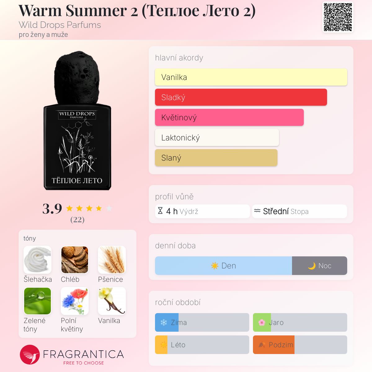 Warm Summer 2 (Теплое Лето 2) podle Wild Drops Parfums je Orientální Vanilla vůně pro ženy a muže. Warm Summer 2 (Теплое Лето 2) byl/a uveden/a v roce 2020. "Nosem" za touto vůní je Anna Nikishina. Vrchní tóny jsou Chléb, Pšenice, Zelené tóny a Sůl; střední tóny jsouŠlehačka, Polní květiny a Akát ; základní tóny jsou Vanilka, Fazole tonka a Bílé dřevo.