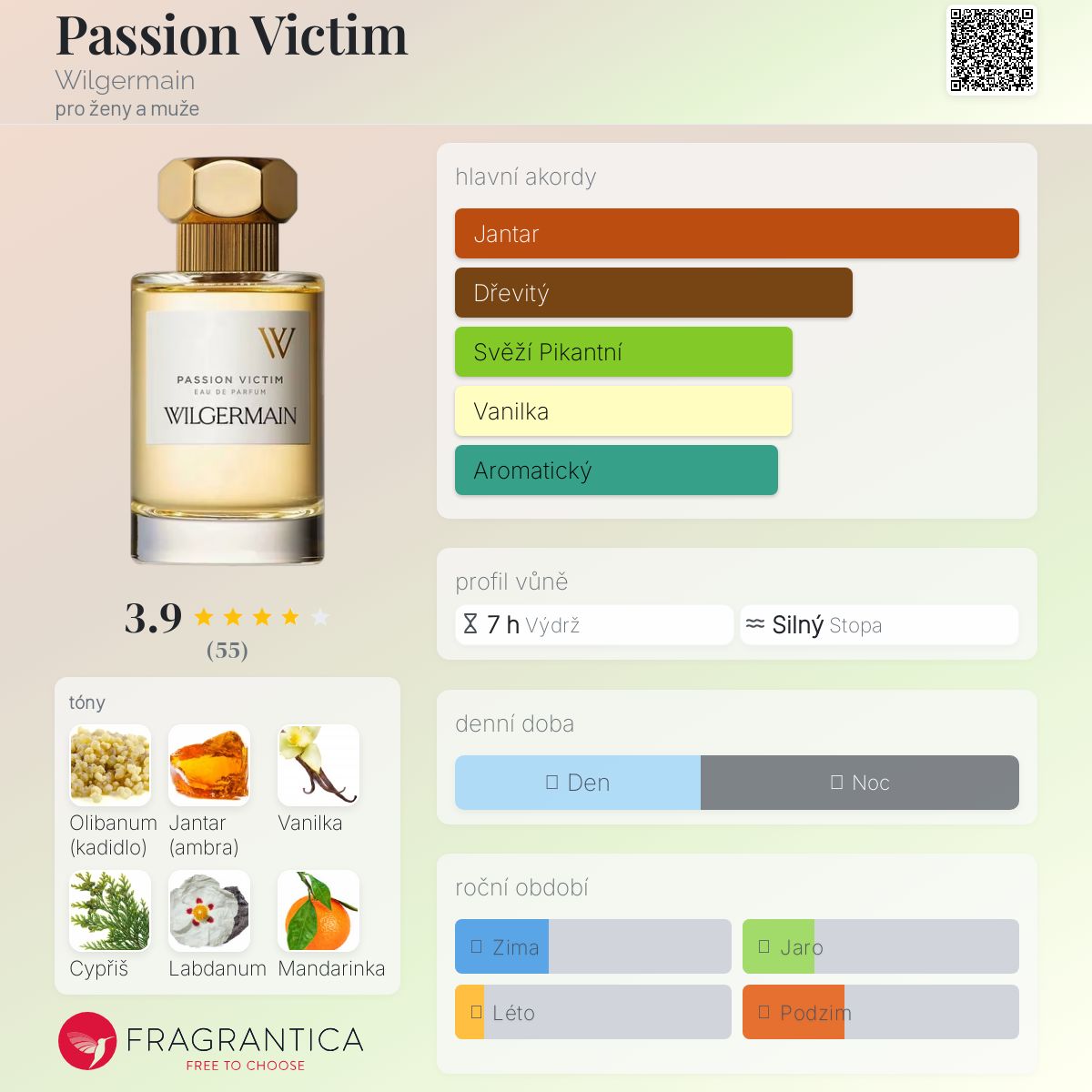 Passion Victim podle Wilgermain je Orientální Floral vůně pro ženy a muže. Passion Victim byl/a uveden/a v roce 2020. "Nosem" za touto vůní je Rodrigo Flores-Roux. Vrchní tóny jsou Cypřiš, Španělské labdanum a Sicilská mandarinka; střední tóny jsouOlibanum, Růže a Egyptský jasmín ; základní tóny jsou Jantar (ambra), Mexická vanilka a Santalové dřevo.