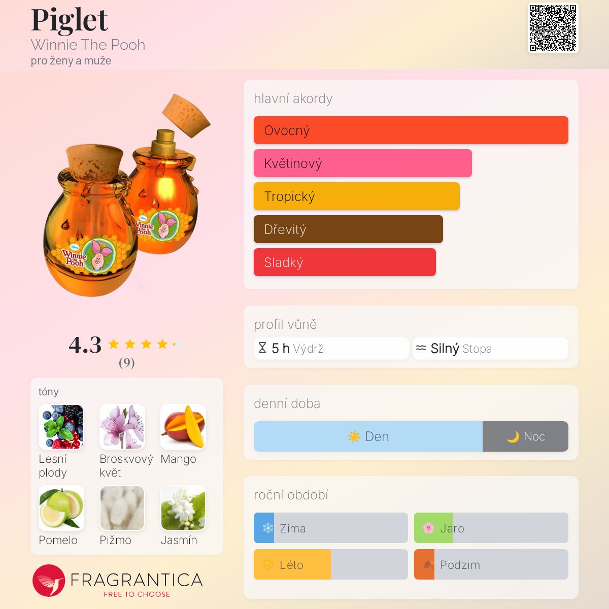 Piglet podle Winnie The Pooh je Floral Fruity vůně pro ženy a muže. Vrchní tóny jsou Lesní plody, Mango a Pomelo; střední tóny jsouBroskvový květ a Jasmín ; základní tón je Pižmo.