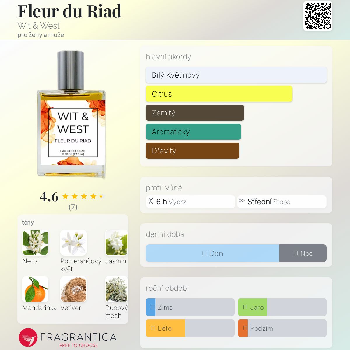 Fleur du Riad podle Wit & West je vůně pro ženy a muže. Fleur du Riad byl/a uveden/a v roce 2021. "Nosem" za touto vůní je Whitney Swales. Vrchní tóny jsou Neroli a Zelená mandarinka; střední tóny jsouPomerančový květ a Jasmín ; základní tóny jsou Vetiver a Dubový mech.