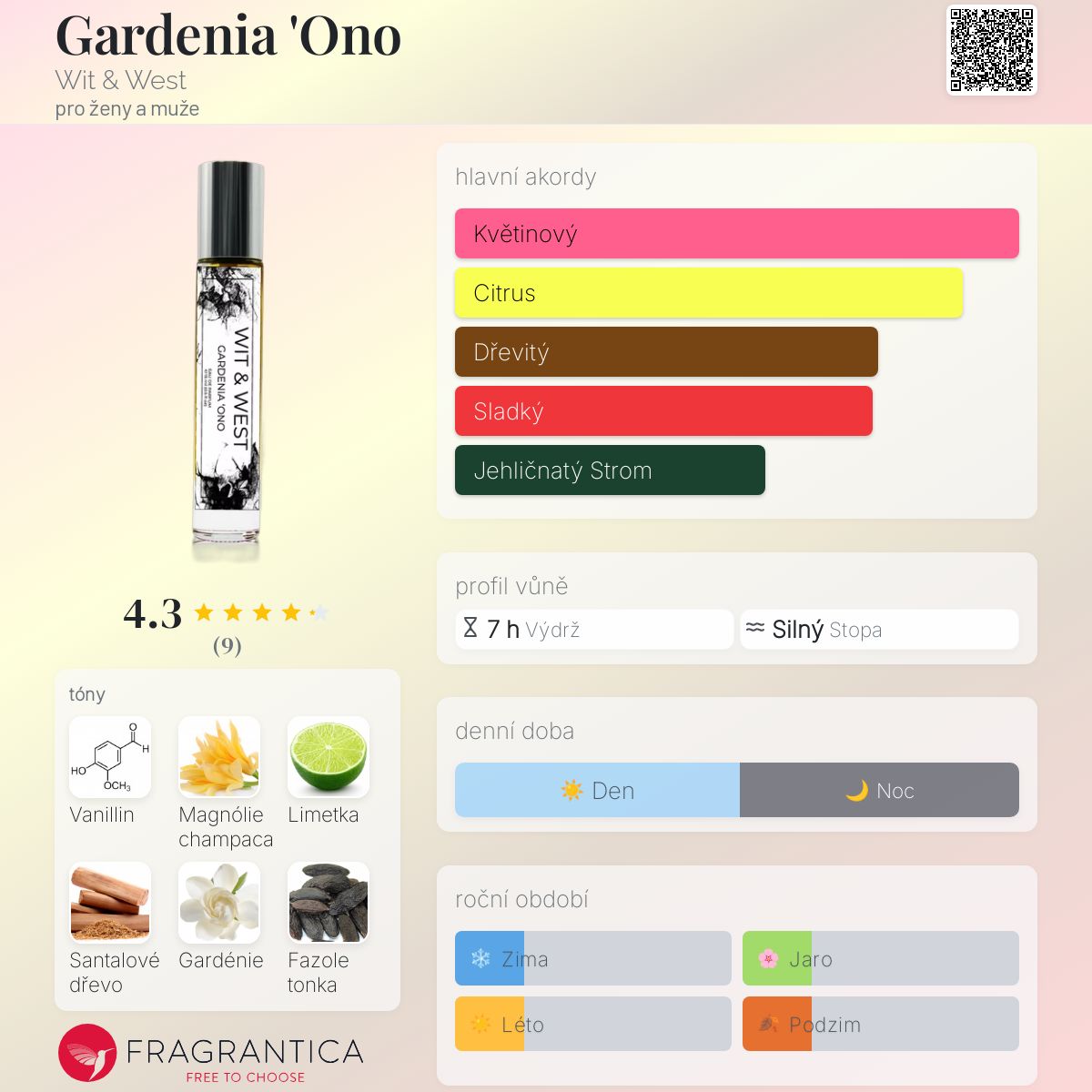 Gardenia 'Ono podle Wit & West je vůně pro ženy a muže. Gardenia 'Ono byl/a uveden/a v roce 2021. "Nosem" za touto vůní je Whitney Swales. Vrchní tóny jsou Vanillin a Limetka; střední tóny jsouMagnólie champaca a Gardénie ; základní tóny jsou Santalové dřevo a Fazole tonka.
