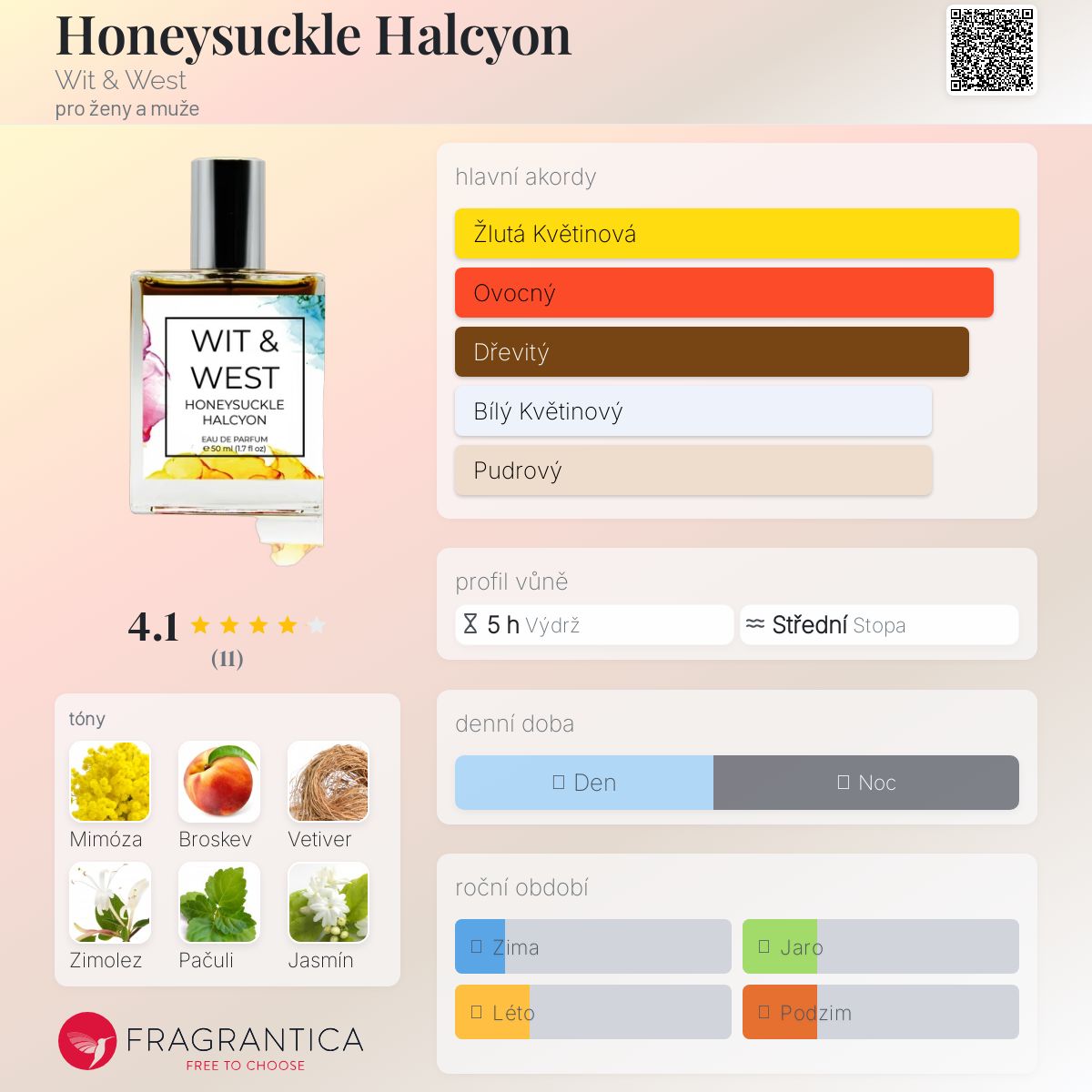 Honeysuckle Halcyon podle Wit & West je vůně pro ženy a muže. Honeysuckle Halcyon byl/a uveden/a v roce 2021. "Nosem" za touto vůní je Whitney Swales. Vrchní tóny jsou Mimóza a Broskev; střední tóny jsouZimolez a Jasmín Sambac ; základní tóny jsou Haitský vetiver a Pačuli.