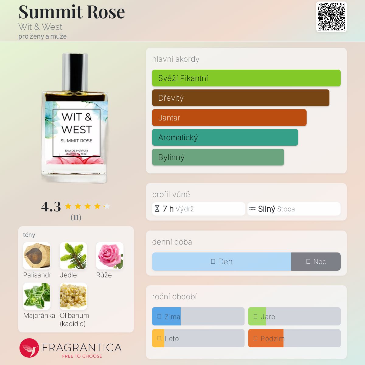 Summit Rose podle Wit & West je vůně pro ženy a muže. Summit Rose byl/a uveden/a v roce 2021. "Nosem" za touto vůní je Whitney Swales. Vrchní tóny jsou Texaský palisandr a Jedle; střední tóny jsouRůže a Majoránka ; základní tóny jsou Olibanum a Jedle balzámová.
