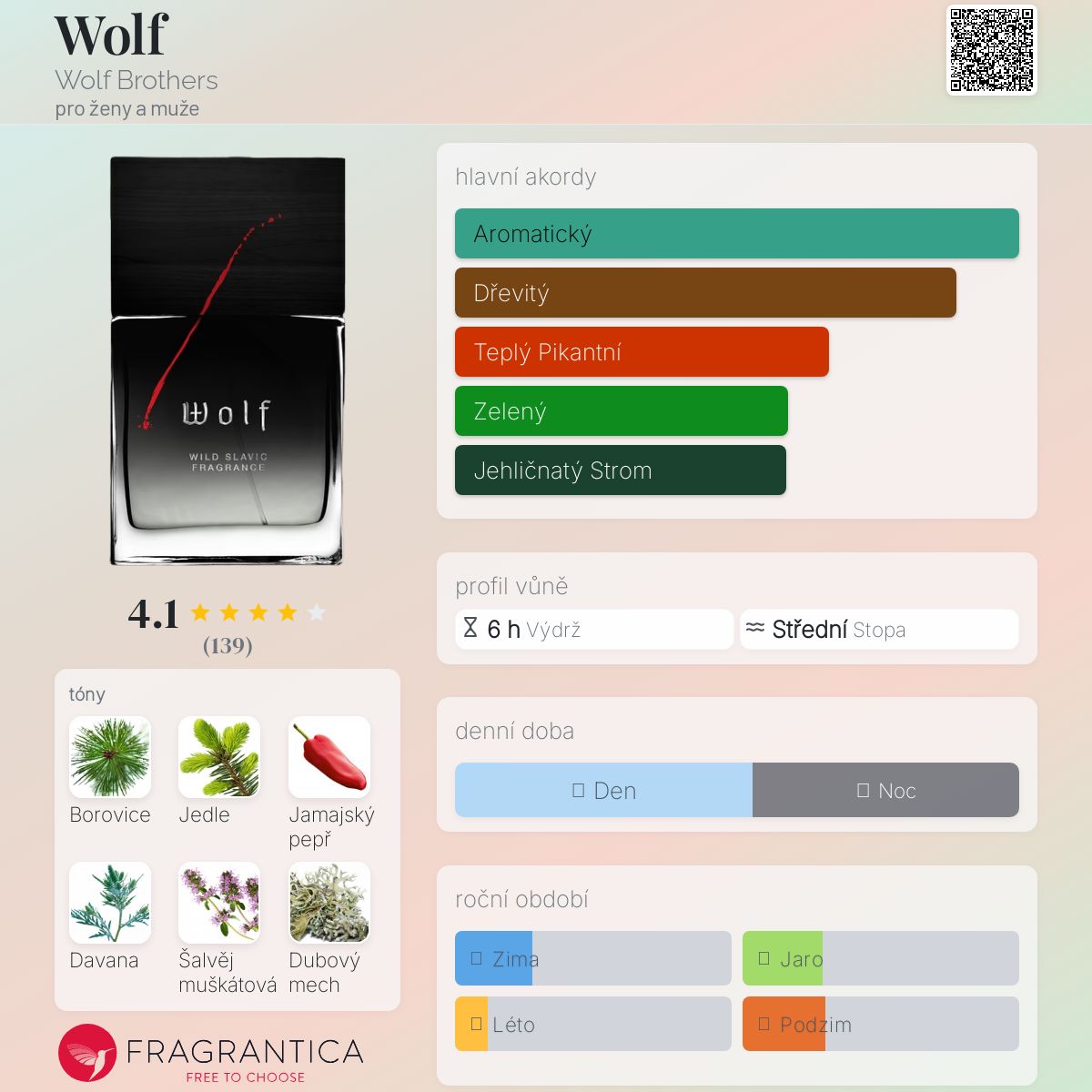 Wolf podle Wolf Brothers je Woody Spicy vůně pro ženy a muže. Wolf byl/a uveden/a v roce 2021. "Nosem" za touto vůní je Jennifer Jambon. Vrchní tóny jsou Červená paprička, Davana, Švestka a Kardamom; střední tóny jsouBorovice, Jedle balzámová, Šalvěj muškátová, Vetiver, Myrha, Cedr a Olibanum ; základní tóny jsou Dubový mech, Kůže, Fazole tonka a Jantar (ambra).
