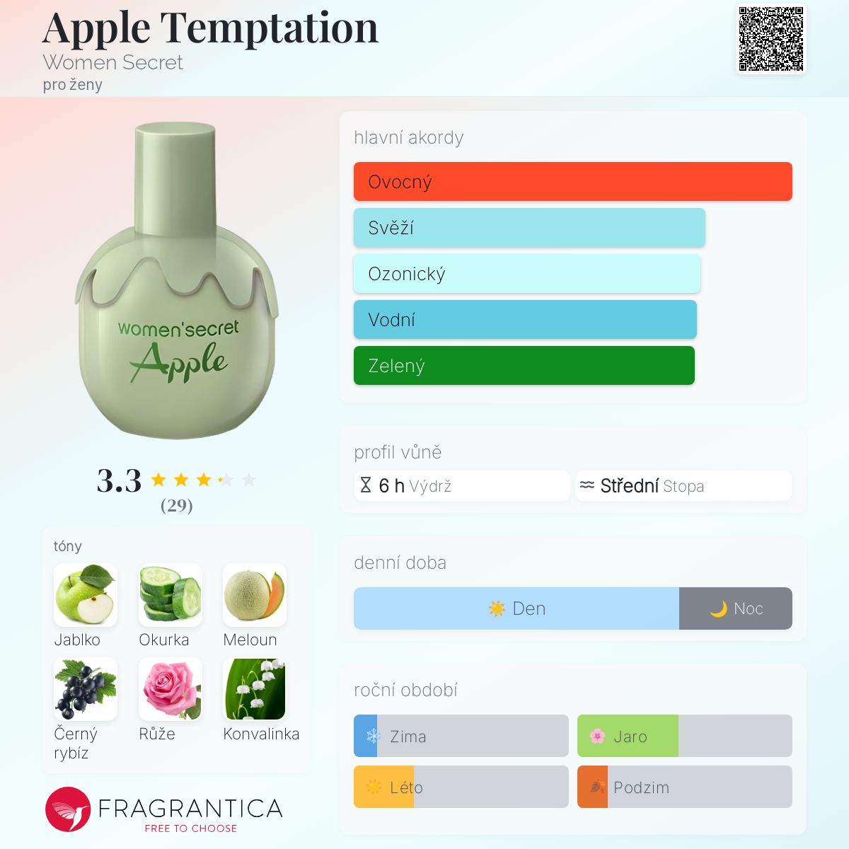 Apple Temptation podle Women Secret je Floral Fruity vůně pro ženy. Apple Temptation byl/a uveden/a v roce 2017. Vrchní tóny jsou Jablko, Okurka, Meloun a Černý rybíz; střední tóny jsouRůže a Konvalinka ; základní tón je Santalové dřevo.