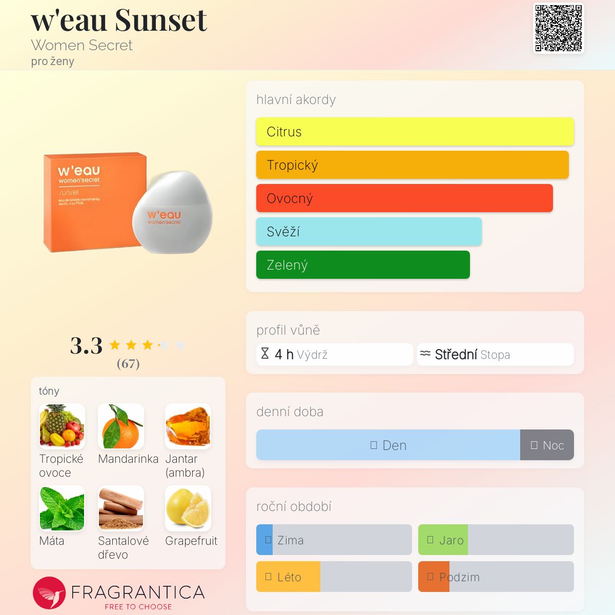 w'eau Sunset podle Women Secret je Floral Fruity vůně pro ženy. w'eau Sunset byl/a uveden/a v roce 2009. Vrchní tóny jsou Mandarinka, Máta, Grapefruit a Bergamot; střední tóny jsouTropické ovoce, Konvalinka a Jasmín ; základní tóny jsou Jantar (ambra), Santalové dřevo a Virginský cedr.