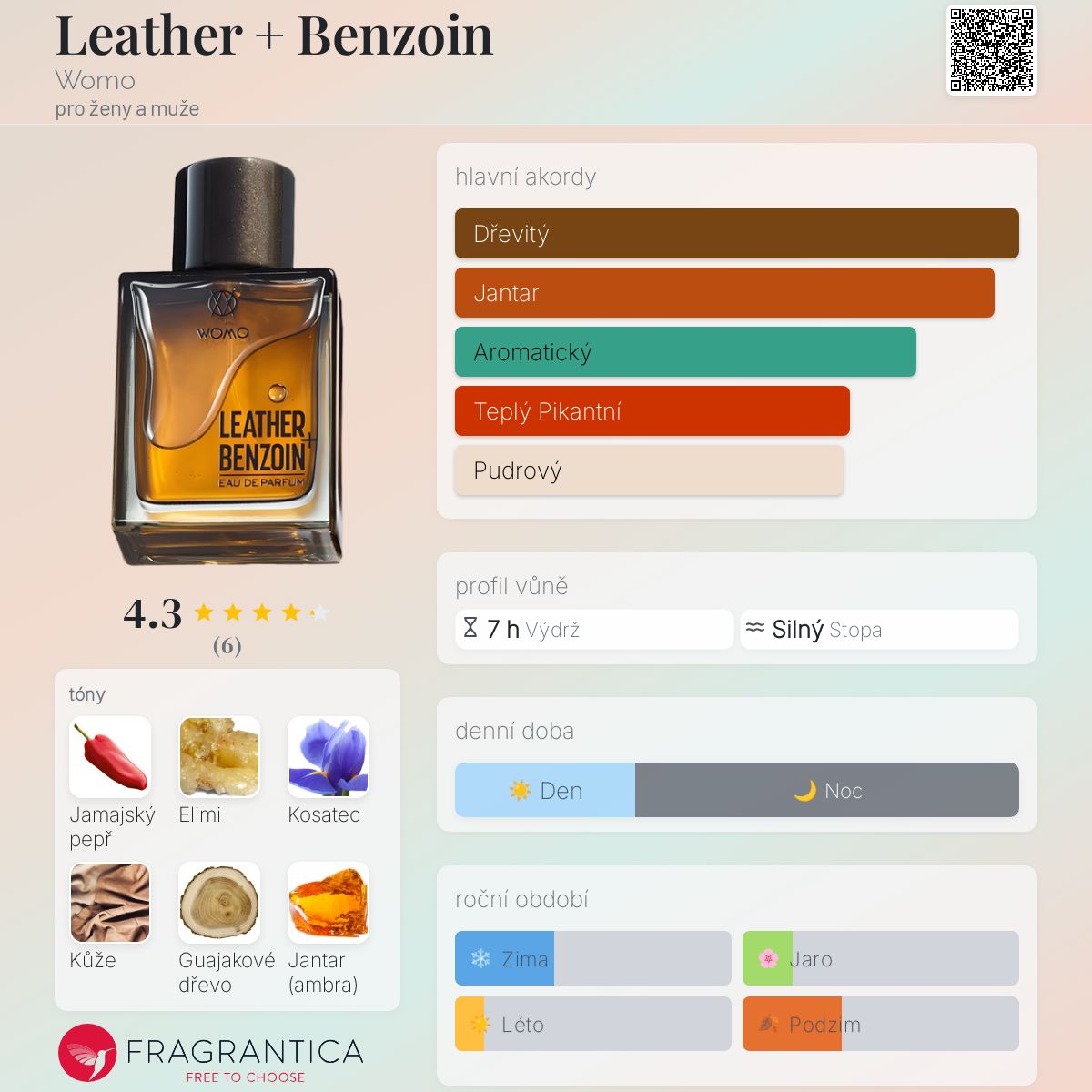 Leather + Benzoin podle Womo je Leather vůně pro ženy a muže. Leather + Benzoin byl/a uveden/a v roce 2017. Vrchní tóny jsou Paprika, Pryskyřice elemi, Růžový pepř, Cedrové jehly a Šalvěj muškátová; střední tóny jsouKosatec, Paraguajský petitgrain, Fialkové listy, Palisandr a Koriandr ; základní tóny jsou Kůže, Guajakové dřevo, Jantar (ambra), Siamský (thajský) benzoin, Kašmír, Java vetiverový olej a Pačuli.