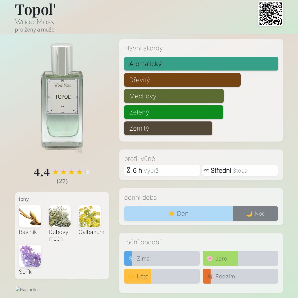 Topol' podle Wood Moss je Woody Floral Musk vůně pro ženy a muže. Topol' byl/a uveden/a v roce 2021.