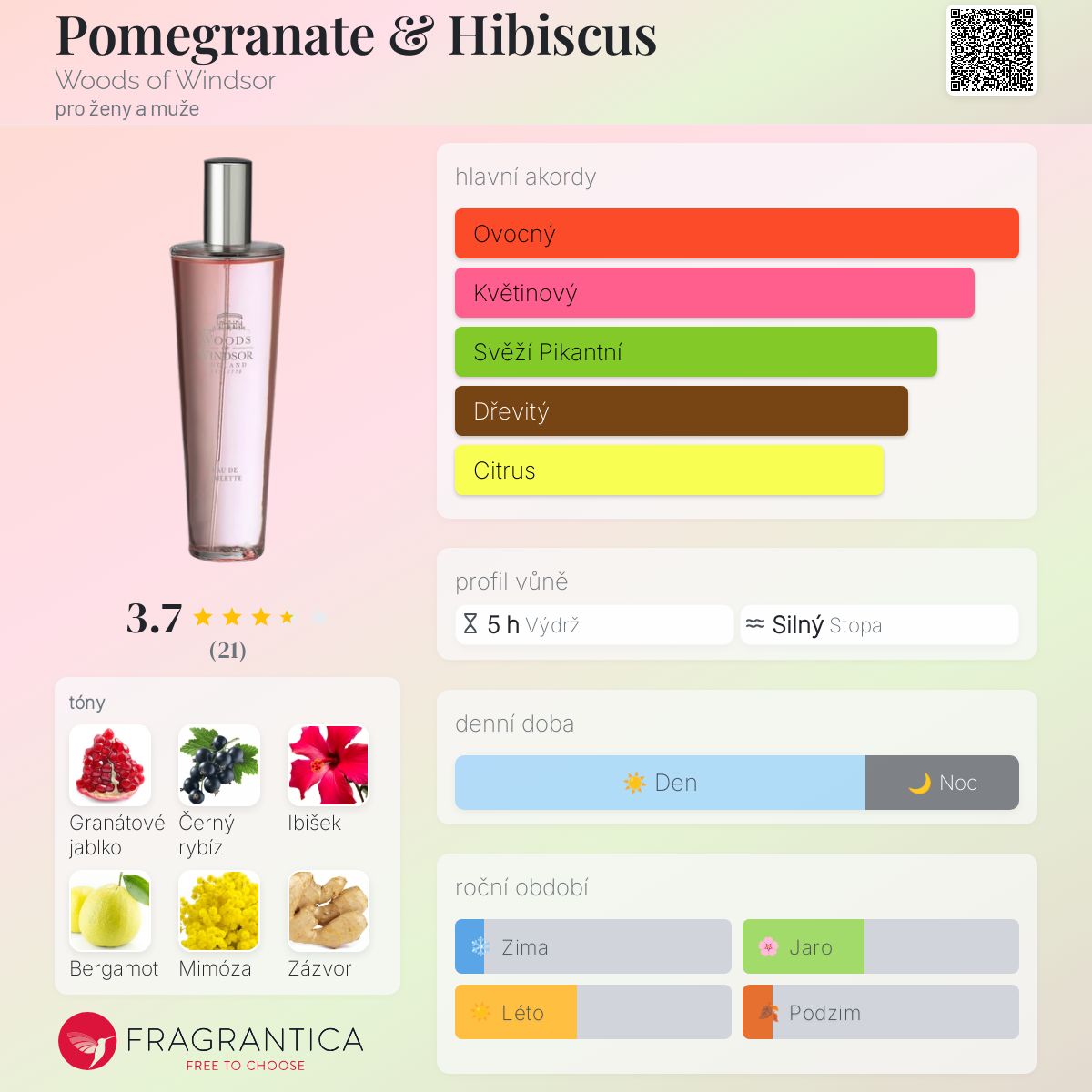 Pomegranate & Hibiscus podle Woods of Windsor je Floral Fruity vůně pro ženy a muže. Pomegranate & Hibiscus byl/a uveden/a v roce 2014. Vrchní tóny jsou Bergamot a Mandarinka; střední tóny jsouGranátové jablko, Černý rybíz, Ibišek, Mimóza a Zázvor ; základní tóny jsou Vanilka a Santalové dřevo.