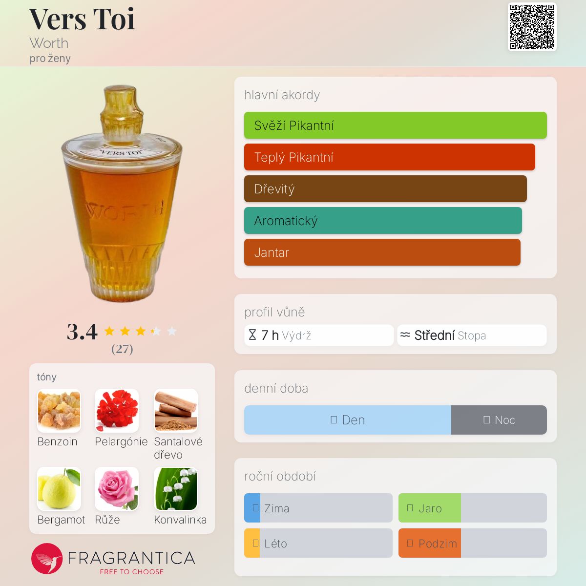 Vers Toi podle Worth je Orientální Floral vůně pro ženy. Vers Toi byl/a uveden/a v roce 1934. "Nosem" za touto vůní je Maurice Blanchet. Vrchní tóny jsou Pelargónie, Bergamot a Levandule; střední tóny jsouRůže, Konvalinka, Palisandr a Jasmín ; základní tóny jsou Benzoin, Santalové dřevo, Vanilka a Pačuli.