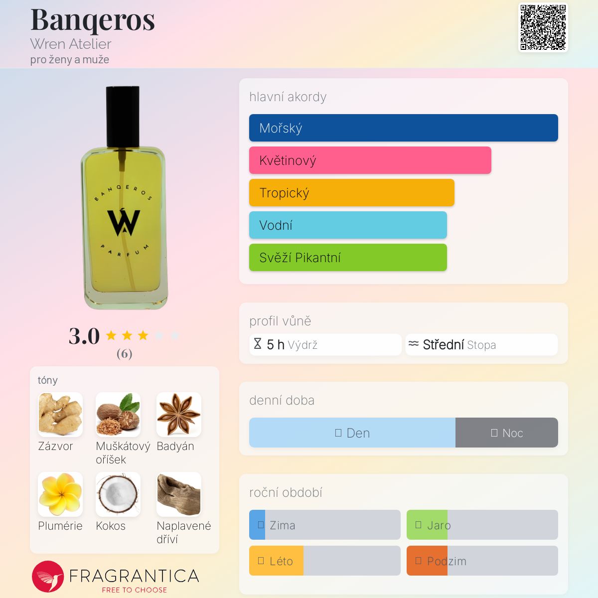 Banqeros podle Wren Atelier je Aromatic Aquatic vůně pro ženy a muže. Banqeros byl/a uveden/a v roce 2022. "Nosem" za touto vůní je Renato Lopena Jr.. Vrchní tóny jsou Zázvor, Muškátový oříšek a Badyán; střední tóny jsouPlumérie a Kokos ; základní tóny jsou Naplavené dříví, Mořské tóny a Mořská řasa.